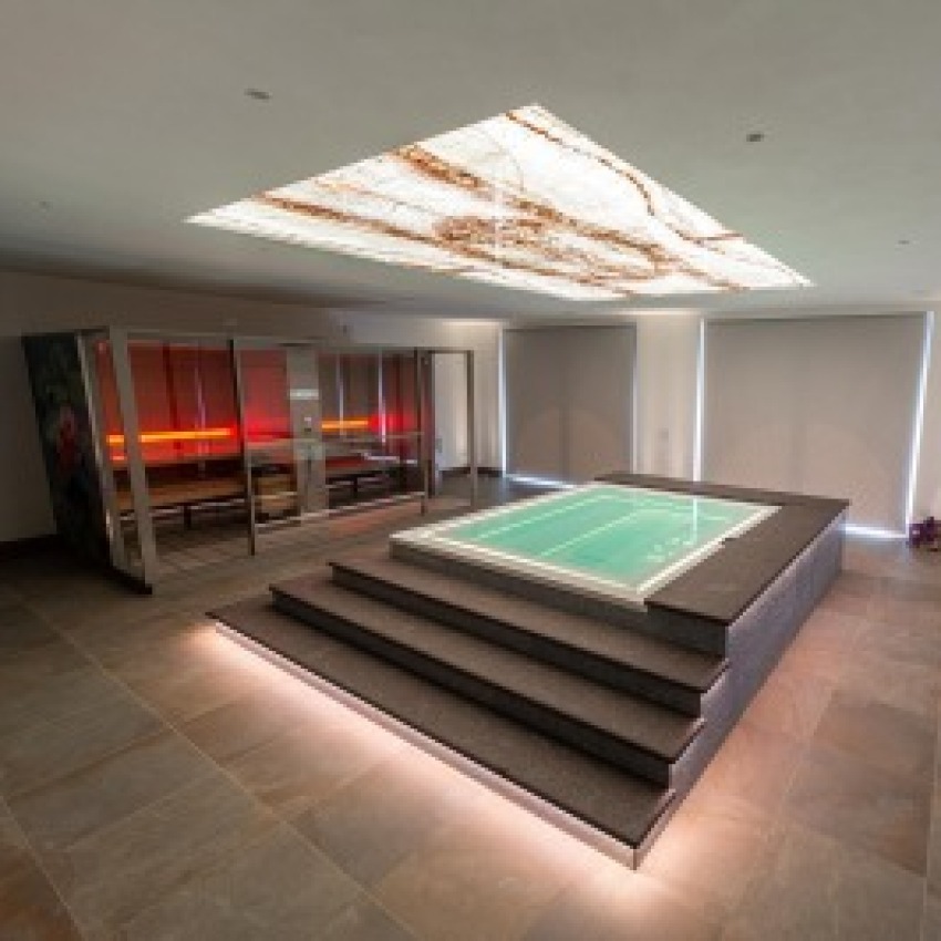 Hydromassage tub covered in Luserna stone and Valcamonica porphyry.