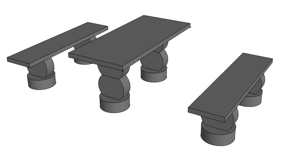 Descrizione Sostegni del piano del tavolo e delle sedute realizzati in nero d'Africa a massello (diametro 40 cm per spessore 15 cm ogni cerchio).