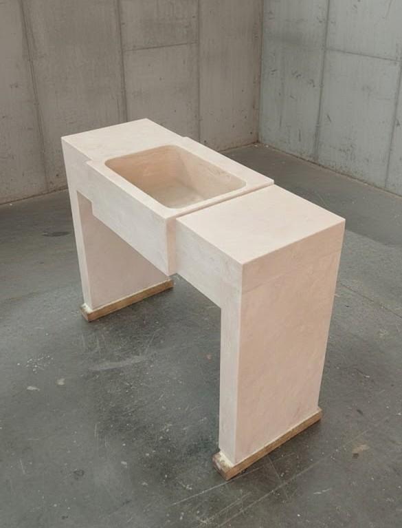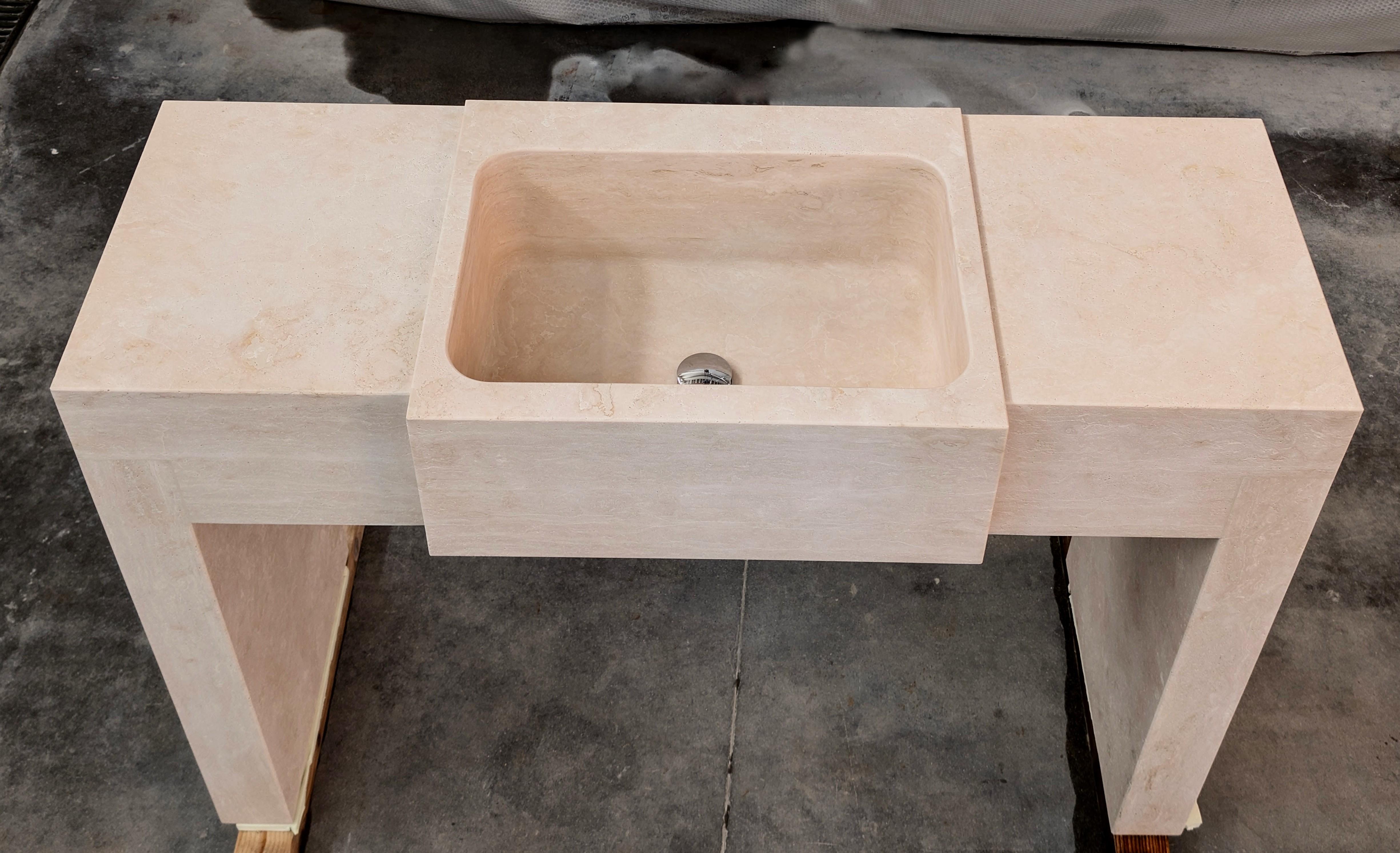Lavabo in Travertino dalla presenza molto importante. Presenta i piani sia a destra che a sinistra e le pareti di appoggio a terra.