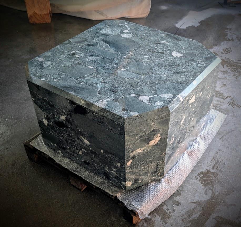 Basamento per scultura in Verde Salvan lucido. La forma è un quadrato con i quattro angoli laterali tagliati e smussi sugli angoli superiori.